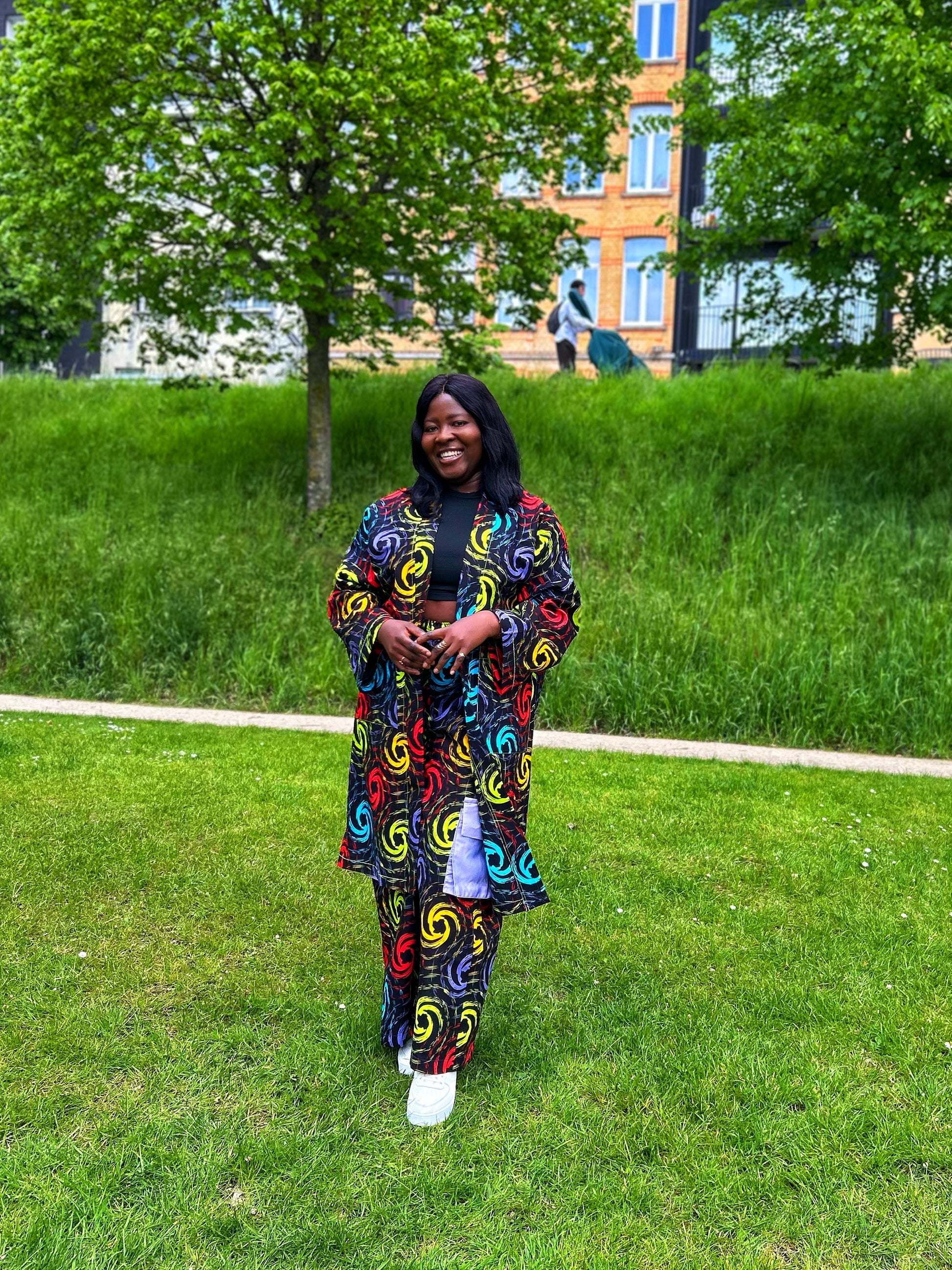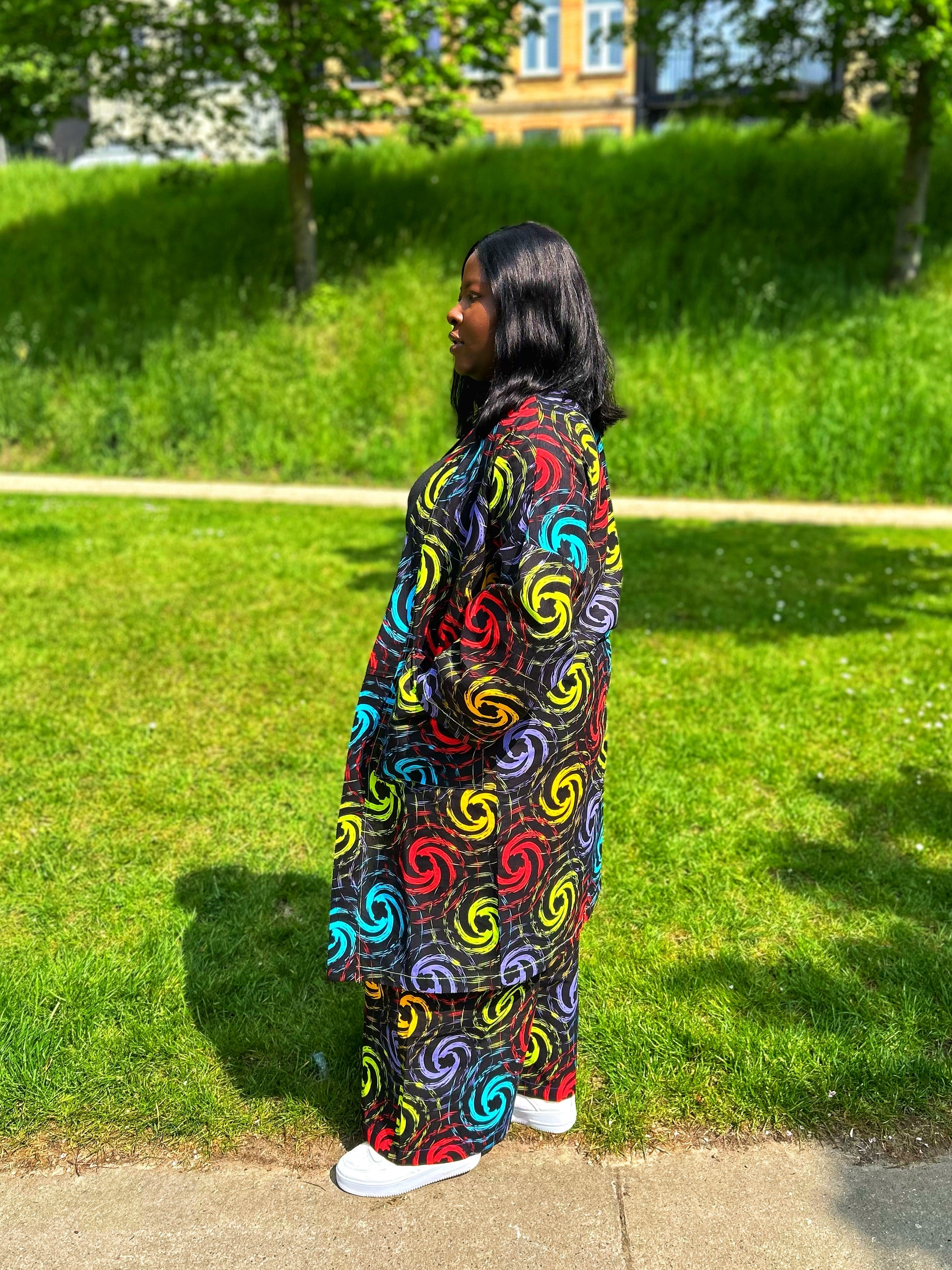 Embrace effortless elegance with The Kemi Set — a dynamic two-piece pairing a 3-quarter length Ankara kimono jacket with high-waisted Ankara jumbo pants. The vibrant, handcrafted Ankara print speaks volumes, while the tailored cut of the jacket and pants creates a flattering silhouette that works for any occasion.